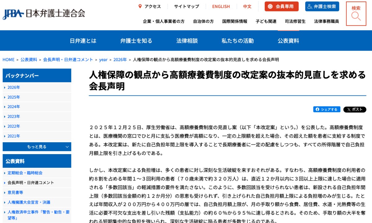 日弁連会長、政府の高額療養費制度の改訂案が憲法や国際人権条約に抵触する可能性を指摘 抜本的見直しを求める声明を発表