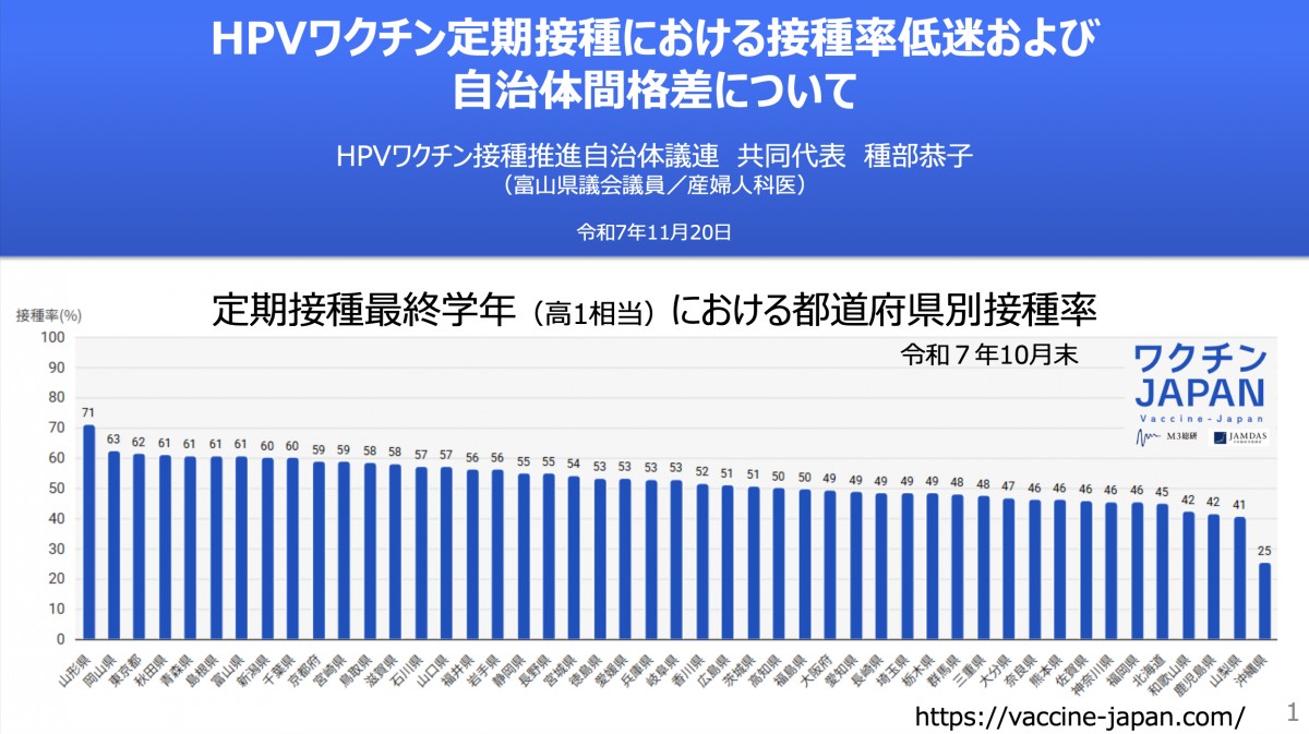 この日は共同代表の一人である富山県議会議員で産婦人科医の種部恭子氏が、ワクチンJAPANのデータから、自治体によって接種率に大きな格差があることと、次の一手として男性への接種が望まれることについて発表した。
