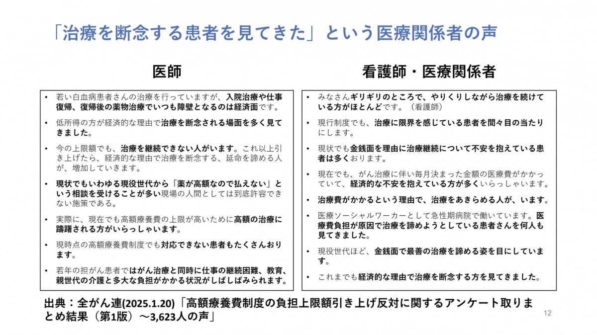 そして「命の選択や治療断念を防ぐために、家計がボロボロになることが現在も生じているし、(今回の見直し案が実現すれば)さらにそれがもっと生じてしまうことが明らかになった」と指摘した。
